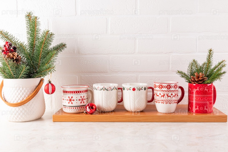 Керамические кружки с новогодним орнаментом стоят на длинной деревянной стойке против белой кирпичной стены на кухонном столе, украшенном для Нового года