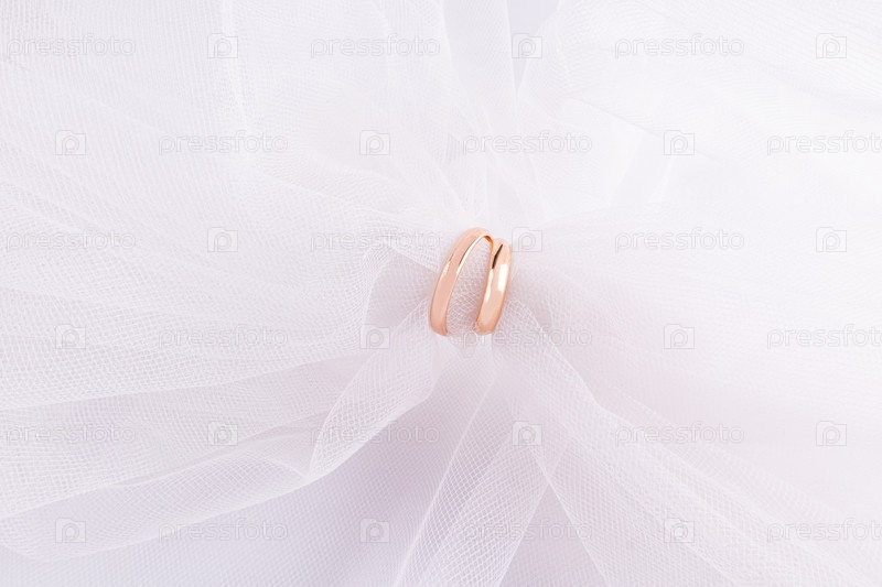 Пара золотых обручальных колец носится над белой классической вуалью невесты. Красивая свадебная компоновка для приглашения, дизайн открытки. Вид сверху. Копировальное пространство