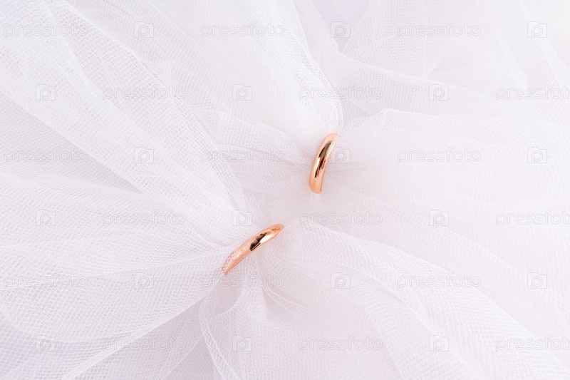 Деликатный белый платок невесты пронизан свадебными золотыми классическими кольцами. Символ любви и верности. Вид сверху. Расписание, приглашение