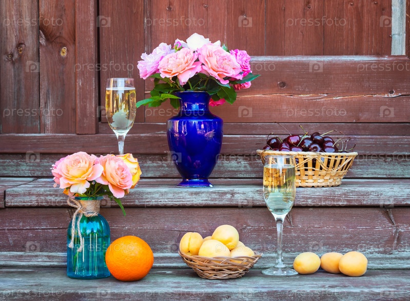 Букеты роз, бокалы шампанского и свежие фрукты находятся на ступеньках деревянной лестницы села