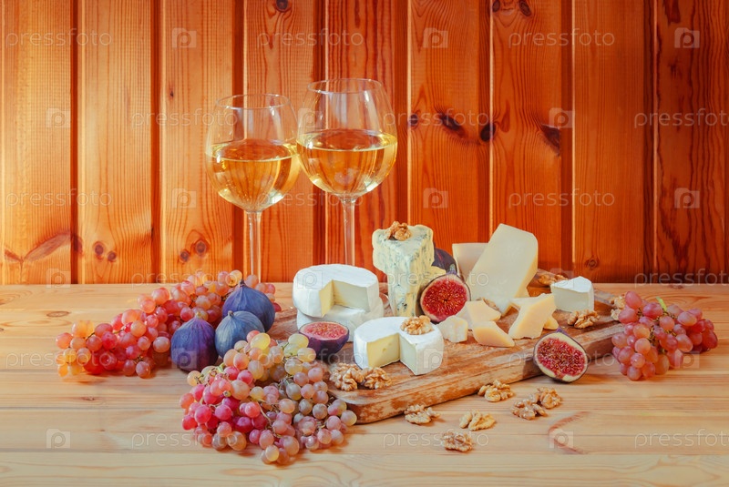 Различные виды сыра, бокалы белого вина, грецкие орехи и фрукты на деревянном столе