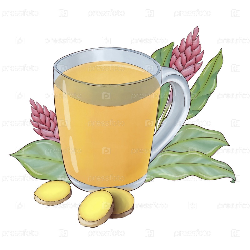 Стекло с имбирным чаем с цветками и корнем имбиря. Цифровые иллюстрации. Подходит для упаковки