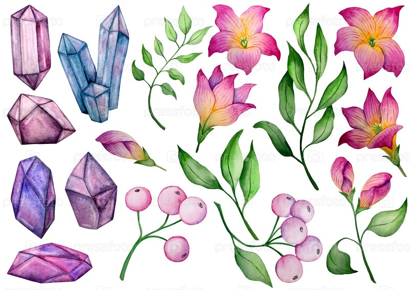 Акварельный набор из цветов, листьев и драгоценных камней