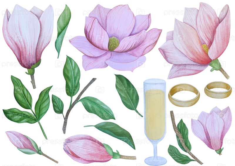 Рукописные иллюстрации с свадебными атрибутами и цветами магнолии выделены белым. Романтическая графика для приглашения, сохранение даты. Свадебное украшение