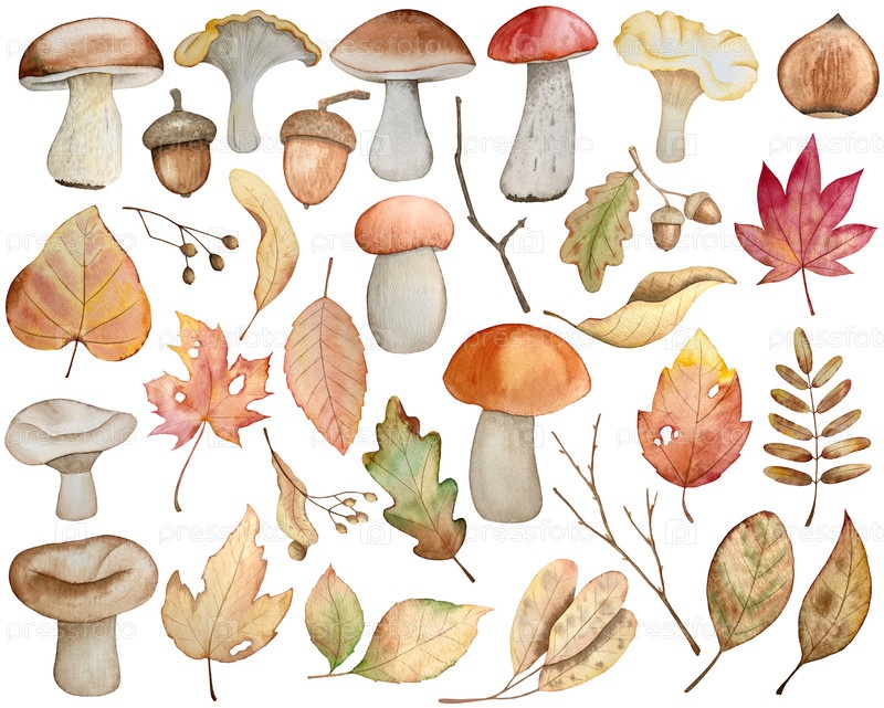 Ручно нарисованный акварельный осенний набор желудей, осенних листьев, грибов, ягод, изолированных на белом фоне. Идеально подходит для создания карт и дизайна. Иллюстрации Дня благодарения