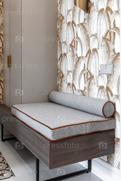 Закрытие стильной входной скамейки серой подушкой и декоративной обои с узорами золотых пальмовых листьев