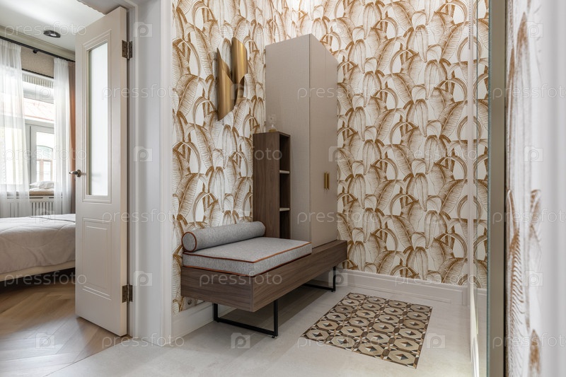 Элегантный коридор с рисунковой обои, мягкая скамейка, гардероб и вид на яркую спальню с естественным светом