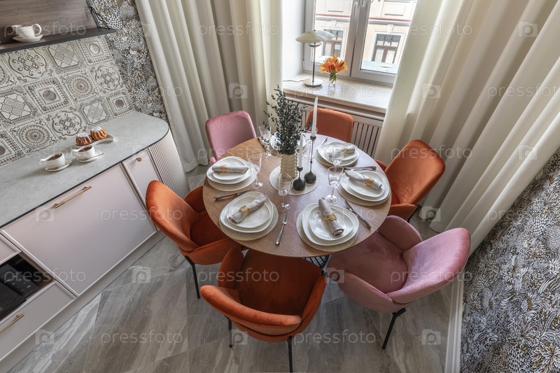 Элегантная трапезная инсталляция с пастельными бархатными стульями, круглым деревянным столом, современной посудой и уютным кухонным интерьером в мягком дневном свете