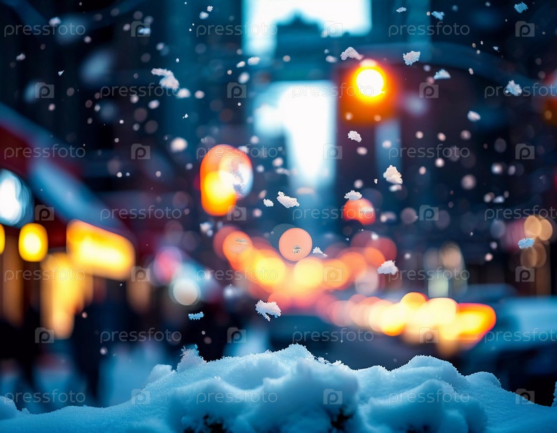 Спокойный зимний вечер окутывает городскую улицу, где медленно падающий снег усиливает сияние рождественских огней. Праздничная атмосфера привлекает людей, празднующих Новый год
