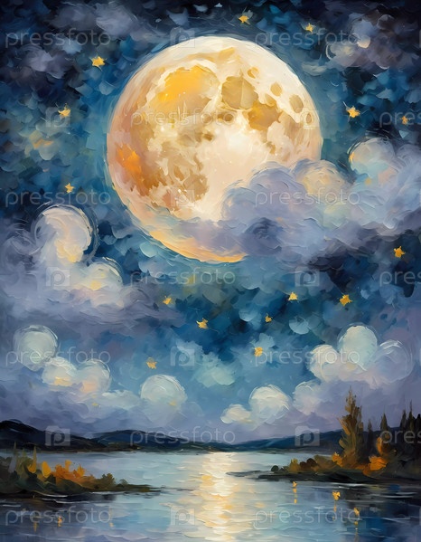 Полнолуние освещает ночное небо, наполненное пушистыми облаками, окрашенными в различные оттенки синего, фиолетового и мягкого белого. Движущиеся звезды добавляют волшебный штрих к этой безмятежной сцене