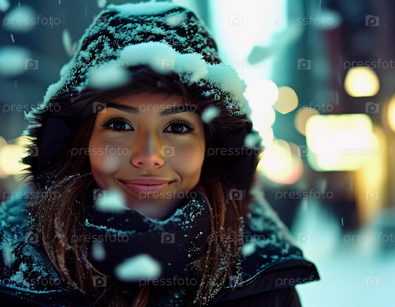 В оживленной городской обстановке молодая женщина мягко улыбается, в то время как снежинки танцуют вокруг нее во время сильного снегопада