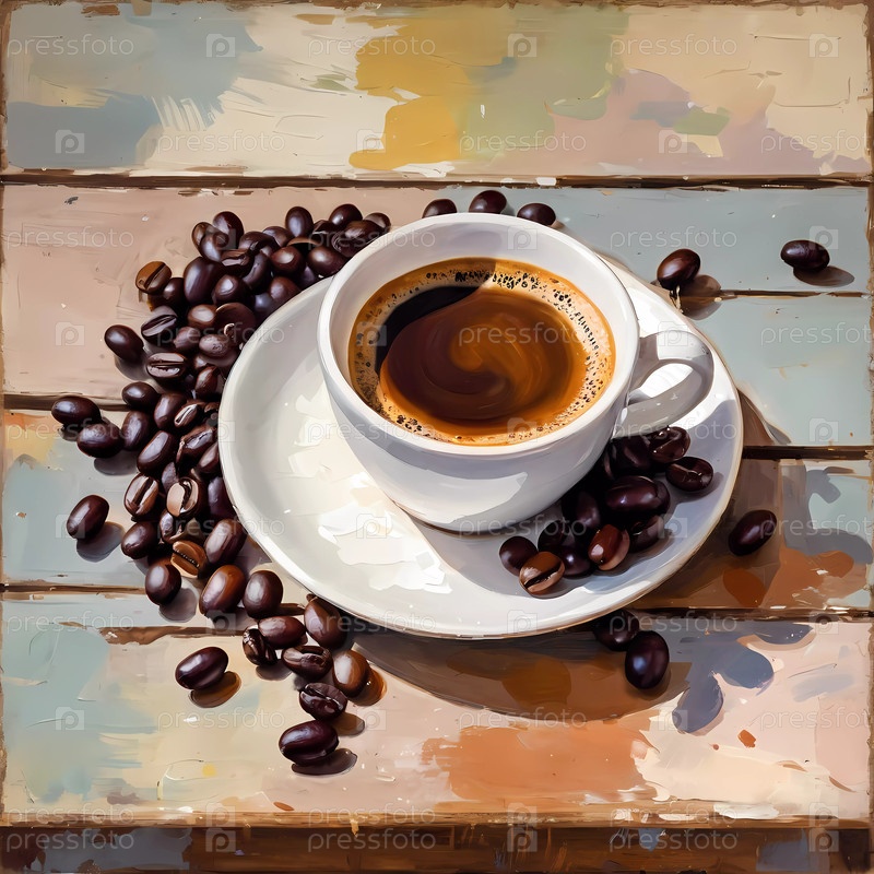 Теплый эспрессо кофе подается в очаровательной белой чашке с дизайном сердца на тарелке кофейных зерен на старинном деревянном столе в уютной атмосфере