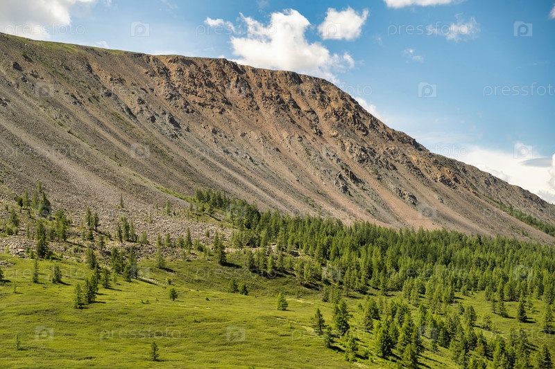Алтай. захватывающий пейзаж горного хребта с ярко-синим небом и пушистыми облаками. На переднем плане можно увидеть зеленые хвойные деревья, а на заднем - величественные горы со скалистыми склонами. Идеально подходит для использования в туристических брош