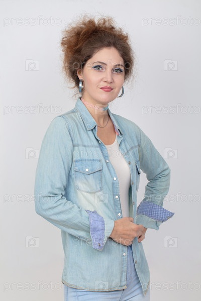 Портрет красивой молодой женщины в джинсовой рубашке, улыбающейся