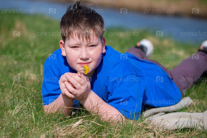 Подросток лежит на лугу и держит в руках одуванчик