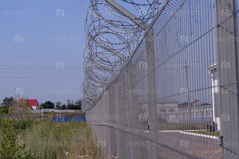 Металлический забор с искривленной колючей проволокой вверху по всему ограждению Россия Воронежская область 13 июля 2025