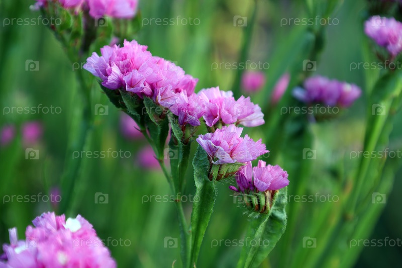 Ярко-розовые цветки сухих цветов (статы) на зеленом фоне