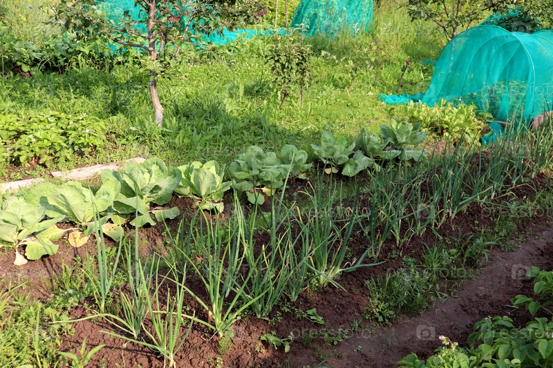 Кровать с созревающей белой капустой и зеленым луком в саду в солнечный летний день