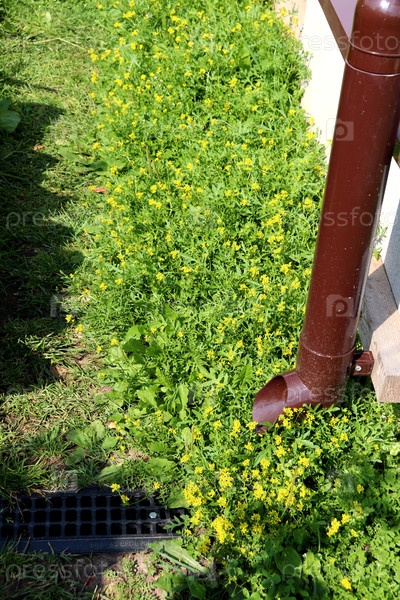 Металлическая труба из канавки на фоне травы с желтыми цветами в углу деревенского дома в саду в солнечный летний день