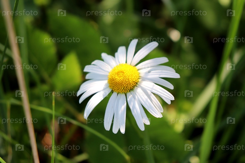 Белая садовая ромашка на фоне травы в солнечном свете летом
