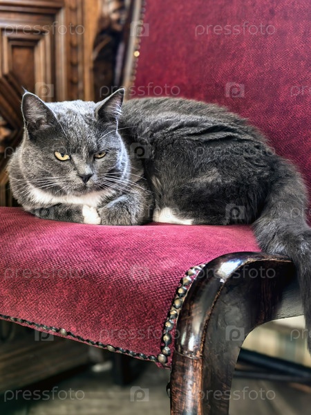 Серый кот расслабляется на красном ретро-кресле