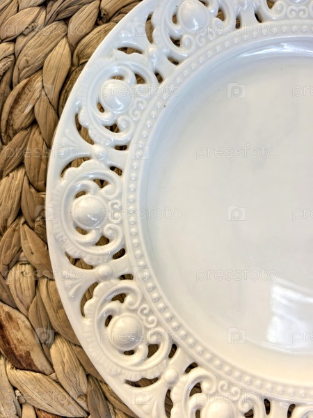 Элегантная белая керамическая тарелка или блюдо на соломенной салфетке