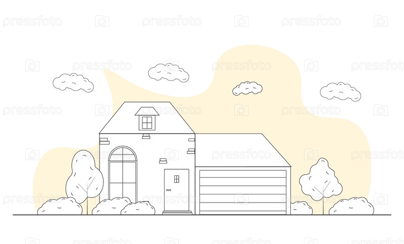 Дом с деревьями в простом плоском линейном стиле.Дом на дереве находится неподалеку.Изображение для веб-сайта, сообщений, листовок и т. Д