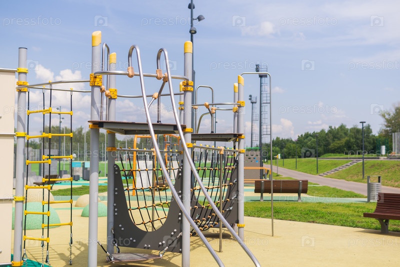 Детская игровая площадка в городском парке для детей с металлической конструкцией