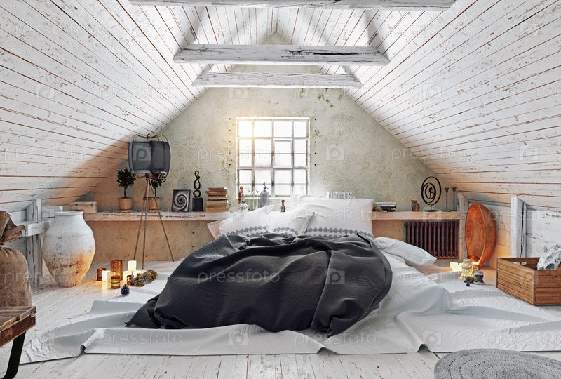 Уютная спальня на чердаке с белыми деревянными стенами и большим окном