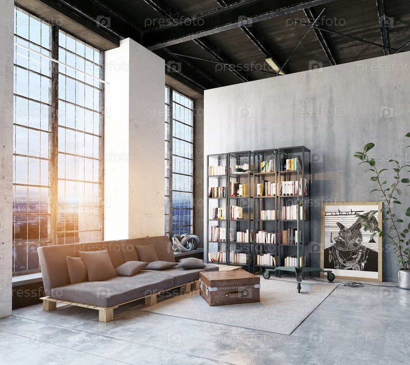 Интерьер промышленного лофта с огромным окном и теплым закатом солнца. 3D-рендеринг