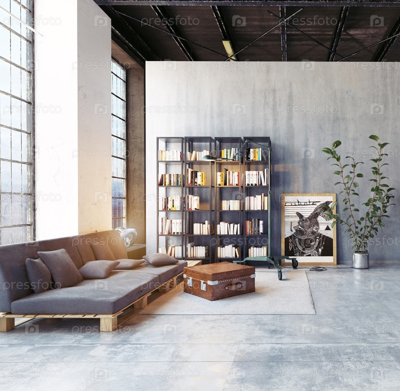 Современный диван и книжная полка у кирпичной стены на чердаке. 3D-рендеринг