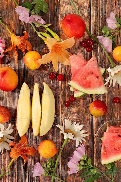 Натюрм с цветами лилии, мяты, малвы, ромашки, яблок, дыни, вишневых и арбузов на солнцезащитном столе, Абстрактная цветочная композиция, фон, концепция праздника с цветами,