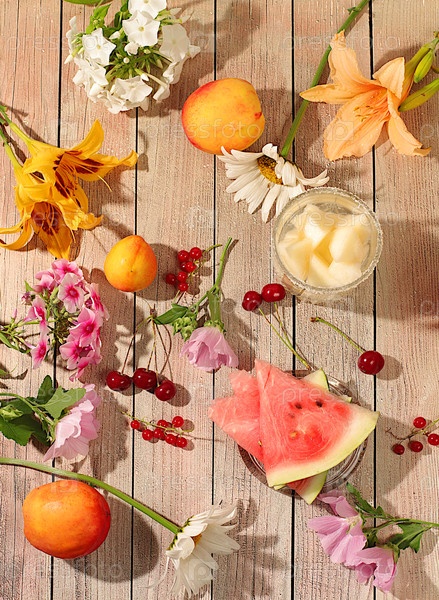 Абстрактная цветовая аранжировка, фон, концепция праздника с цветами, осенний и летний баннер. Цветы лилии, мяты, малины, ромашки, яблок, дыни, вишни и арбуза на солнечном столе,