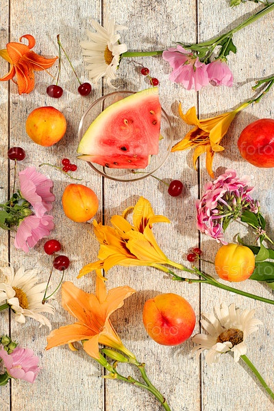 Осенние и летние баннеры. натюрморт с цветами лилии, мяты, малвы, ромашины, яблок, дыни, вишневых и арбузов на солнцезащитном столе, Абстрактная цветочная композиция, фон,