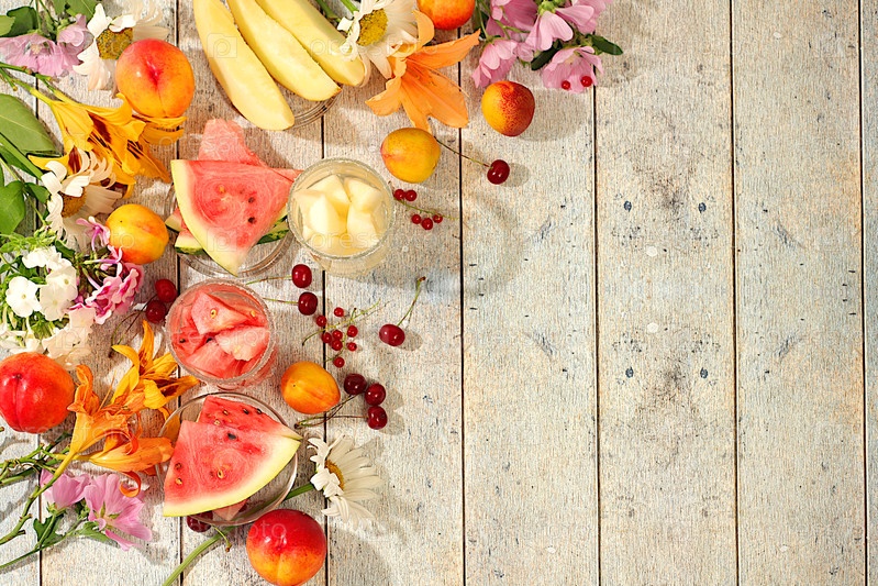 Осенне-летний баннер с фруктовыми напитками. натюрморт с цветами, лилиями, мятой, малиной, ромашками, яблоками, дынями, вишней и арбузом на солнечном столе. абстрактная цветовая композиция, фон