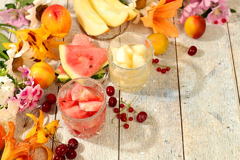 Осенне-летний баннер с фруктовыми напитками. натюрморт с цветами, лилиями, мятой, малиной, ромашками, яблоками, дынями, вишней и арбузом на солнечном столе. абстрактная цветовая композиция, фон