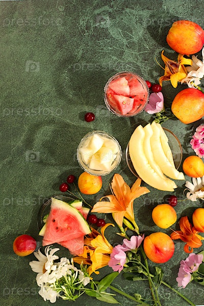 Осенне-летний баннер с фруктовыми напитками. натюрморт с цветами, лилиями, мятой, малиной, ромашками, яблоками, дынями, вишней и арбузом на солнечном столе. абстрактная цветовая композиция, фон