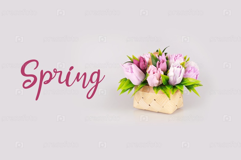 Шаблон приветственной карточки.Тюльпановая корзина, изолированная на белом фоне