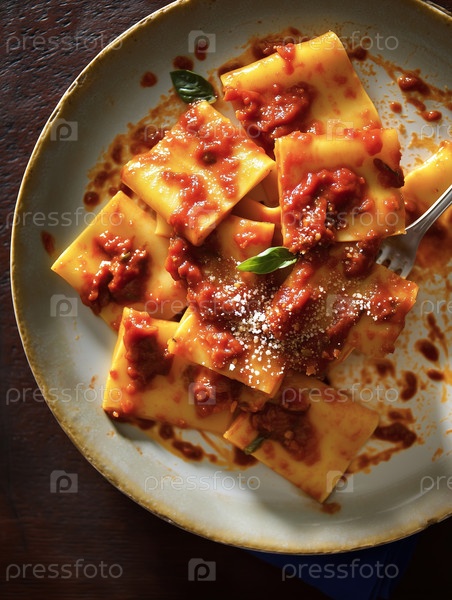 Итальянские макароны с томатным соусом и пармезаном на деревенской тарелке