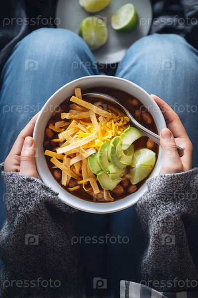 Женщина держит миску чили с авокадо и сыром
