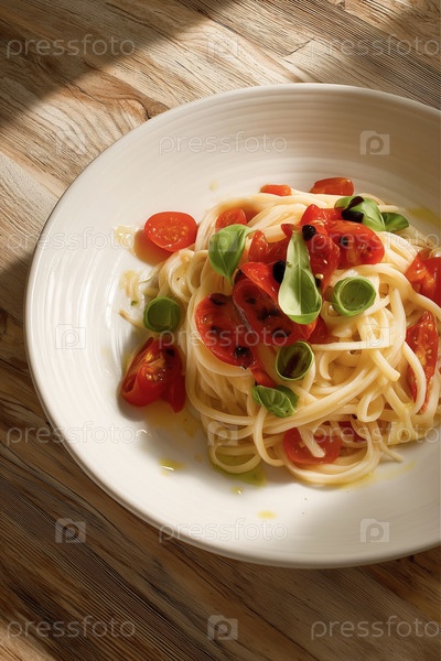 Свежие спагетти с вишневыми помидорами и базиликом на белой тарелке