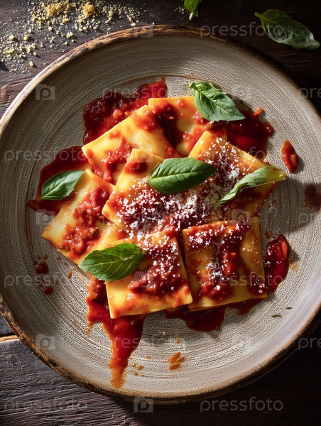 Тарелка макаронных изделий с томатным соусом и гарниром базилика