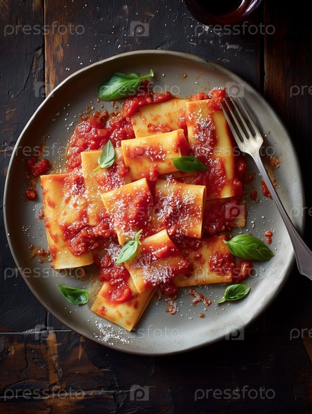 Традиционная итальянская макароны с томатным соусом и базиликом