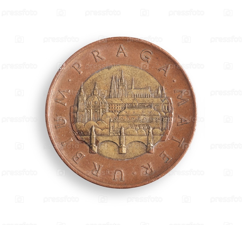 Монета чешских 50 крон.Чешская надпись '50 крон.Святой Вацлав, не дай нам и нашему будущему погибнуть.Элемент дизайна с подстриженной тропой