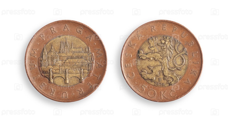 Монета чешских 50 крон. Чехская надпись 'Чешская Республика'. 50 крон. Святой Вацлав, не дай нам и нашему будущему погибнуть. Элемент дизайна с подстриженной тропой