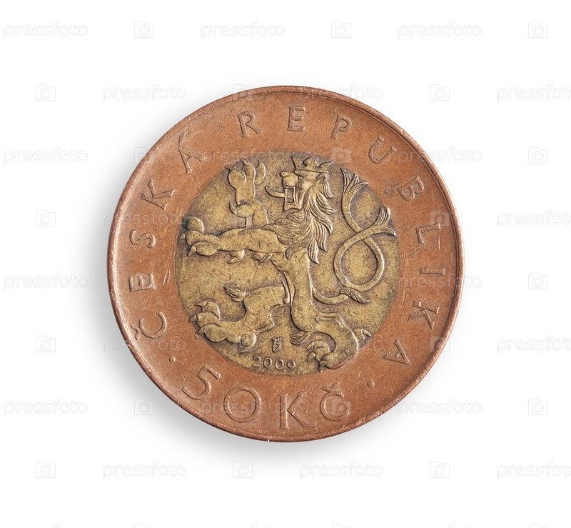 Монета чешских 50 крон. Чехская надпись 'Чешская Республика' на английском языке. Элемент дизайна с обрезанной дорожкой