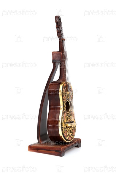 Сувенирная гитара с золотым орнаментом изолирована на белом фоне