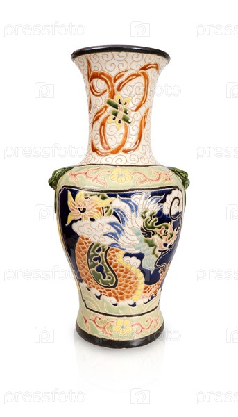Китайская ваза в древних традициях выделялась на белом фоне