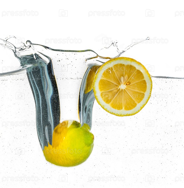 Лимоны падают в воду с пузырями и брызгами на изолированном фоновом макете