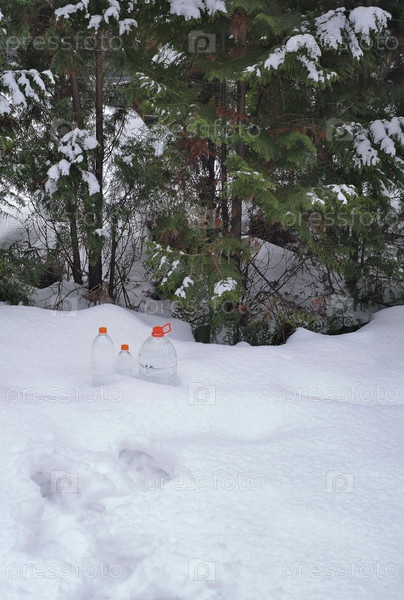 Бутылка питьевой воды в лесу под снегом